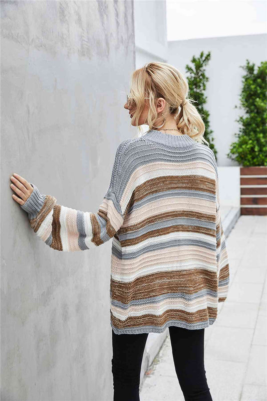 Striped Slit Turtleneck Drop Shoulder Sweater